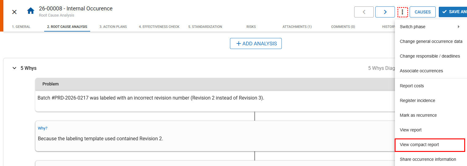 The Compact Report is a consolidated view containing all relevant information about an occurrence, displayed by treatment step. It includes data such as: