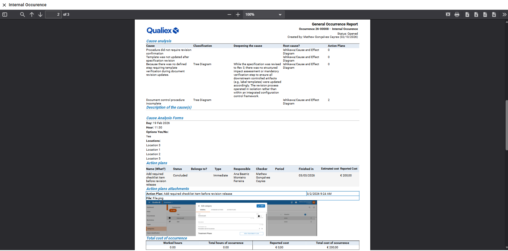 - Attachments: Displays the names of the files attached to the occurrence and actions; images will be shown directly in the report.