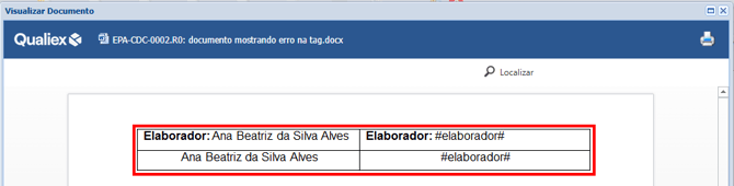 Quando enviamos um documento com esse modelo, ao visualizar o documento que contém a tag correta, as informações serão preenchidas automaticamente. Já para a tag digitada de forma incorreta, será exibida uma mensagem de erro.