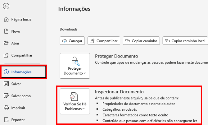 Antes de compartilhar ou finalizar um arquivo, é comum que documentos do Word armazenem informações ocultas, como comentários, versões anteriores, autores, notas de revisão e até dados de cabeçalho e rodapé. Caso um cabeçalho e rodapé do Docs, não seja aplicado automaticamente recomendamos inspecionar o documento para remover algumas inconsistências que geram incompatibilidade.