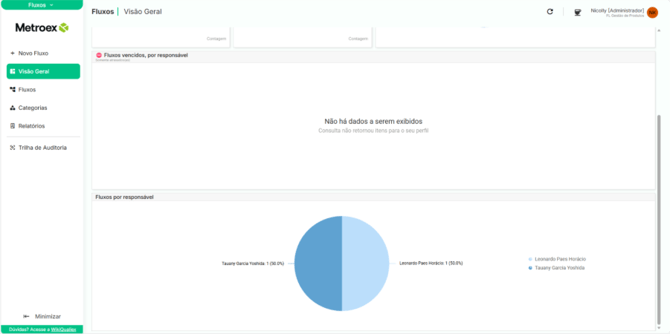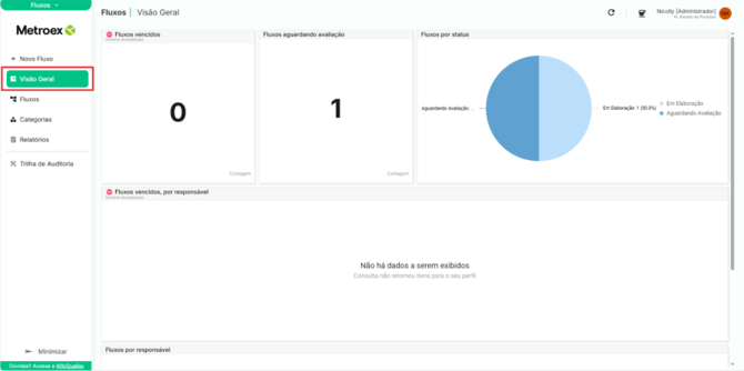 A tela de Visão Geral funciona como o painel de controle do gestor. Ela traduz a lista de fluxos em gráficos e números, permitindo que você identifique problemas e distribua melhor as tarefas da equipe com uma rápida olhada.