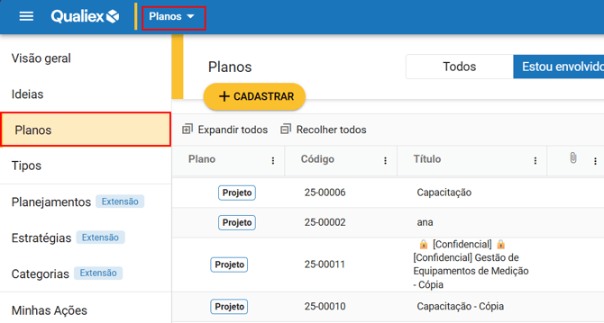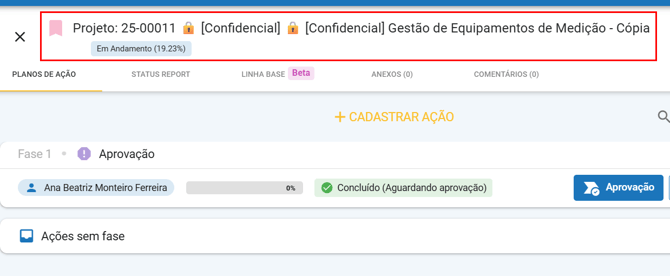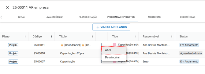 Ao selecionar a opção “Abrir“, o sistema verifica se o colaborador possui permissão para visualizar o programa ou projeto selecionado. Caso possua, ele será direcionado diretamente para esse programa ou projeto dentro do módulo “Planos”.
