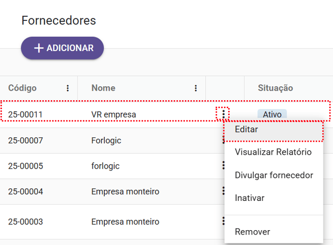 No módulo Fornecedores, acesse a aba “Fornecedores”
