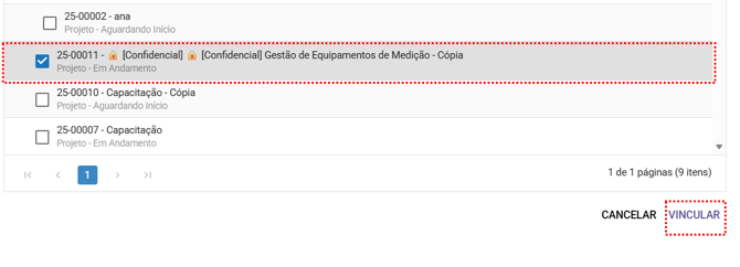 Selecione as caixas de seleção do programa e projeto e clique em "Vincular"