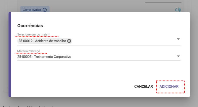 Selecione as caixas de seleção da ocorrência e clique em "Adicionar"