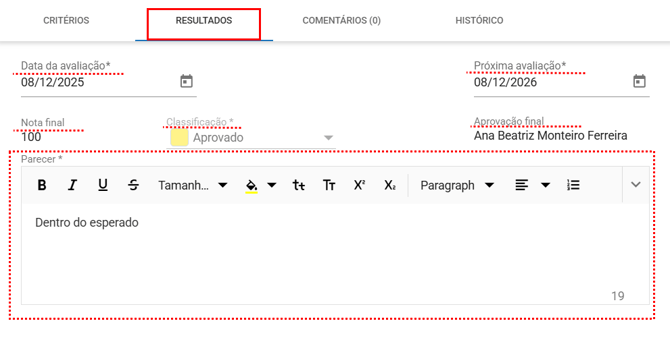 Parecer * : Possibilita deixar um comentário ou conclusão sobre a avaliação, fornecendo um resumo ou análise adicional.