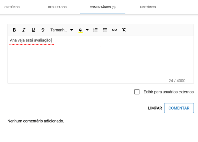Na aba "Histórico", você pode visualizar todas as alterações realizadas na sua avaliação, incluindo data, horário e o usuário responsável por cada modificação.