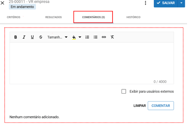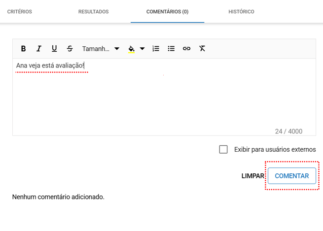 Na aba "Comentários" é possível realizar comentários diretamente na área de comentários.