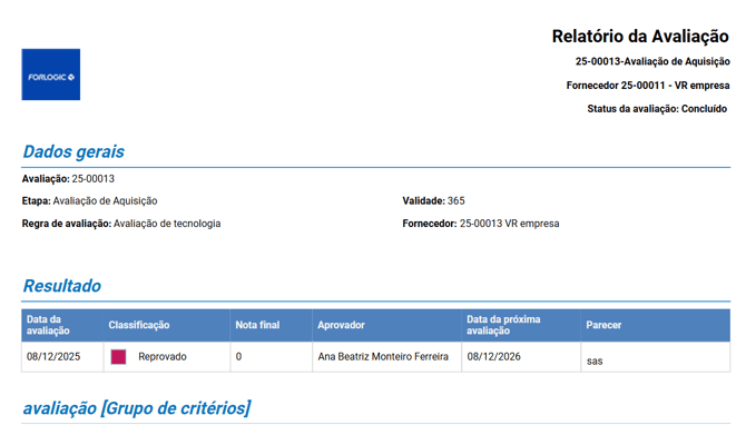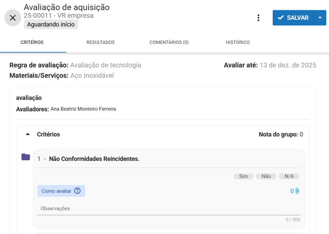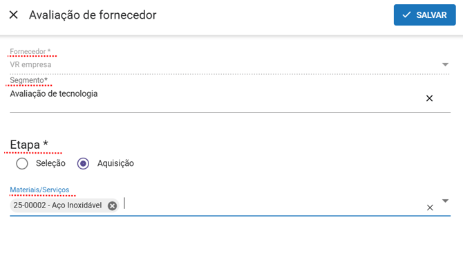 - Campo obrigatório que indica qual fornecedor está sendo avaliado. Esse campo já vem preenchido automaticamente pelo sistema e não é editável.