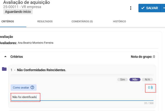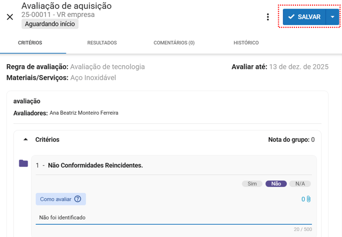 Salvar: Permite salvar os dados sem concluir a avaliação.