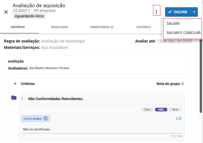 Salvar e concluir: Salva os dados e finaliza a avaliação.