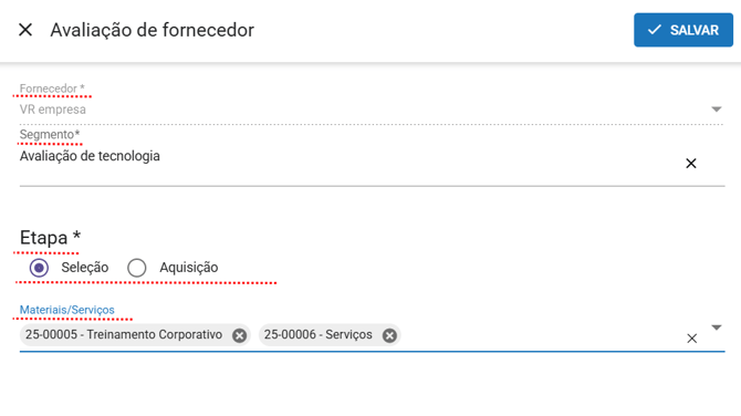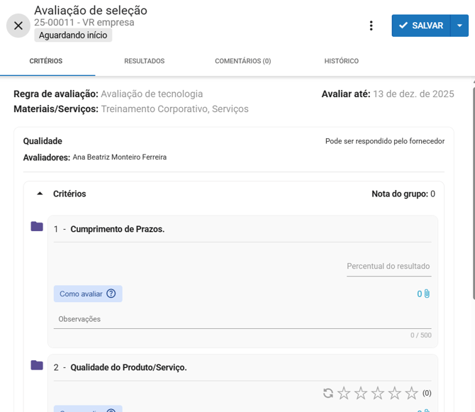 - Campo obrigatório que indica qual fornecedor está sendo avaliado. Esse campo já vem preenchido automaticamente pelo sistema e não é editável.