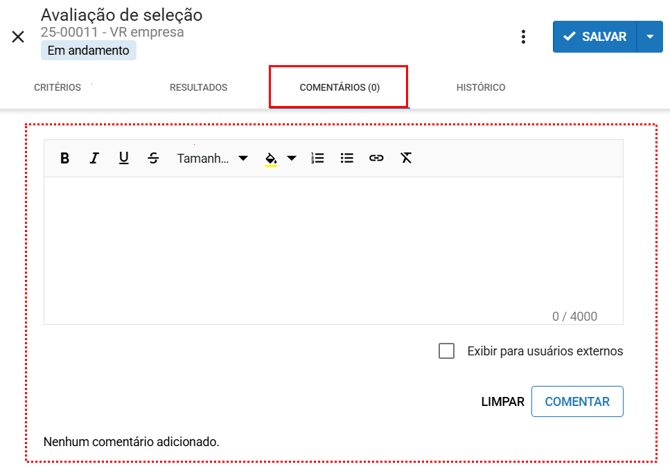Na aba "Comentários" é possível realizar comentários diretamente na área de comentários.