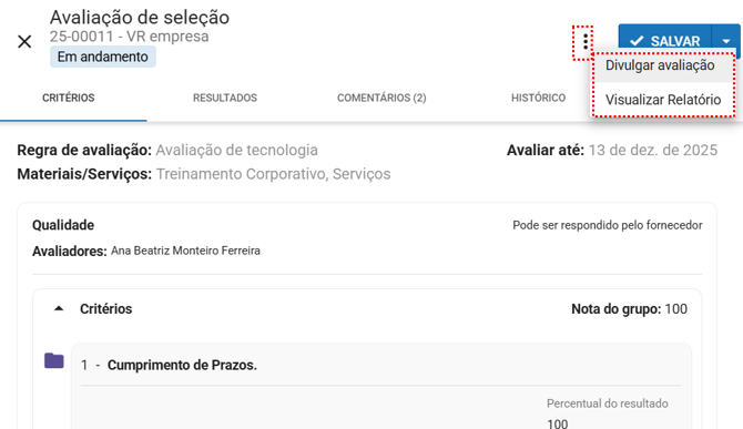 Essa funcionalidade permite compartilhar a avaliação com outras pessoas por e-mail, garantindo que todos os envolvidos tenham acesso às informações.