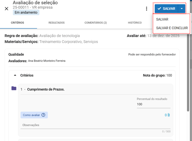 Salvar e concluir: Salva os dados e finaliza a avaliação.