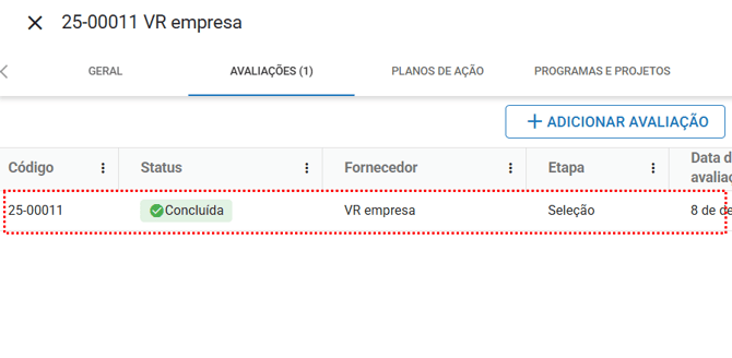 Após a conclusão da Avaliação, todas as avaliações serão exibidas em forma de lista com as suas informações.