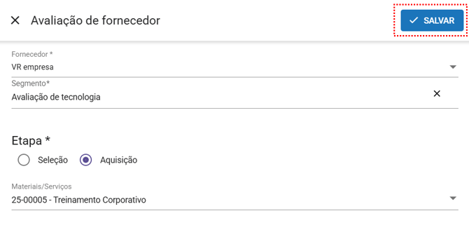 - Etapa(Obrigatório): Indica em qual momento do relacionamento o fornecedor está sendo avaliado escolha a etapa Aquisição.