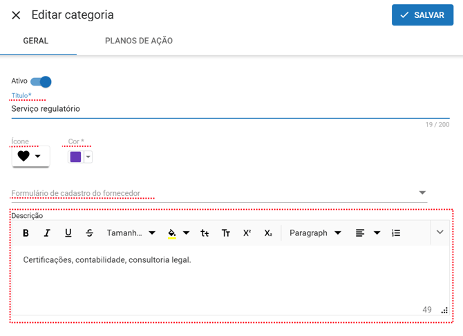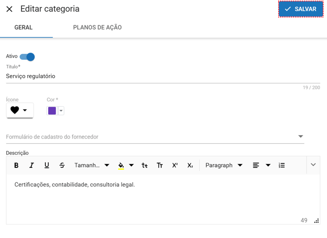 - Descrição: Se for necessário alguma descrição sobre a categoria, insira nesse campo. Essa informação ficará registrada apenas dentro da categoria, não aparecendo no momento de cadastrar o fornecedor.