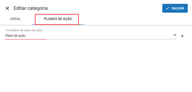 Ao lado, temos a aba "Planos de ação". Nela, é possível vincular um formulário de plano de ação, que será exibido no momento em que você cadastrar uma ação em um fornecedor que possua essa categoria vinculada.