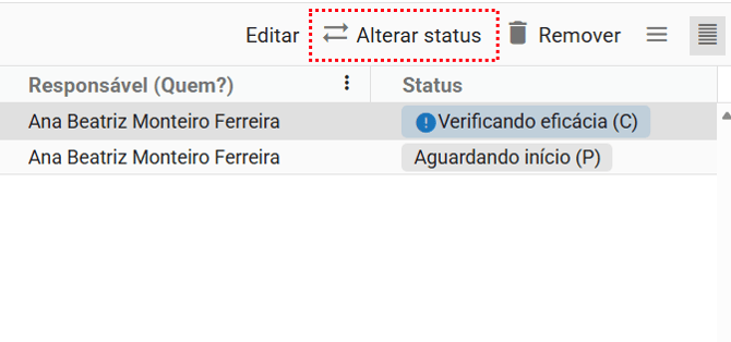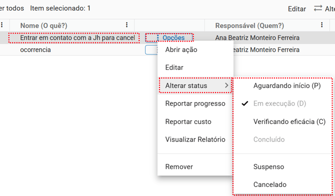 Na ação em que você deseja alterar o status, clique com o botão esquerdo do mouse sobre ela ou utilize o botão