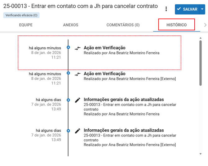 Essa movimentação é registrada no histórico da ação, possibilitando a rastreabilidade das informações: