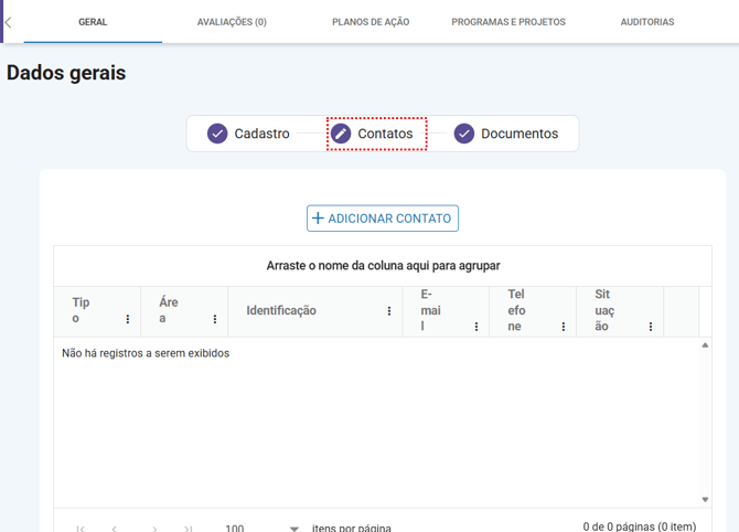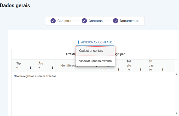 Na Na aba “Contatos”, você pode cadastrar um novo contato do fornecedor ou vincular um usuário externo, utilizando as opções disponíveis no botão de