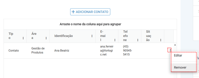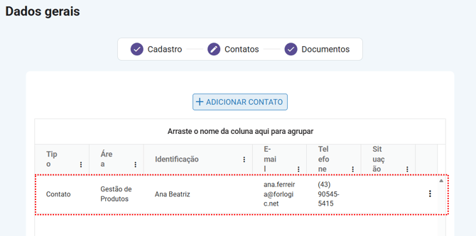 Após salvar o contato, ele passará a ser exibido na listagem de contatos do fornecedor: