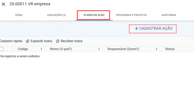 Após acessar o fornecedor desejado, clique na aba “Planos de ação”, onde você poderá cadastrar sua ação clicando em
