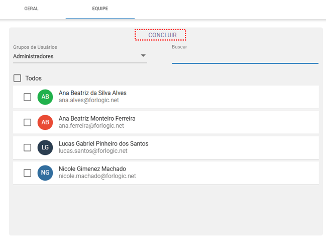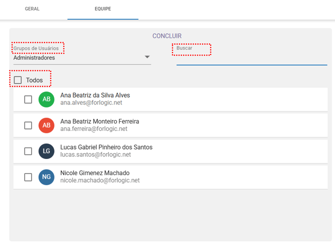 - Todos: Ao realizar uma busca ou selecionar um grupo de usuários, a opção "Todos" será exibida. Essa opção permite selecionar todos os colaboradores listados na sua pesquisa, facilitando a inclusão de toda a equipe de uma só vez.