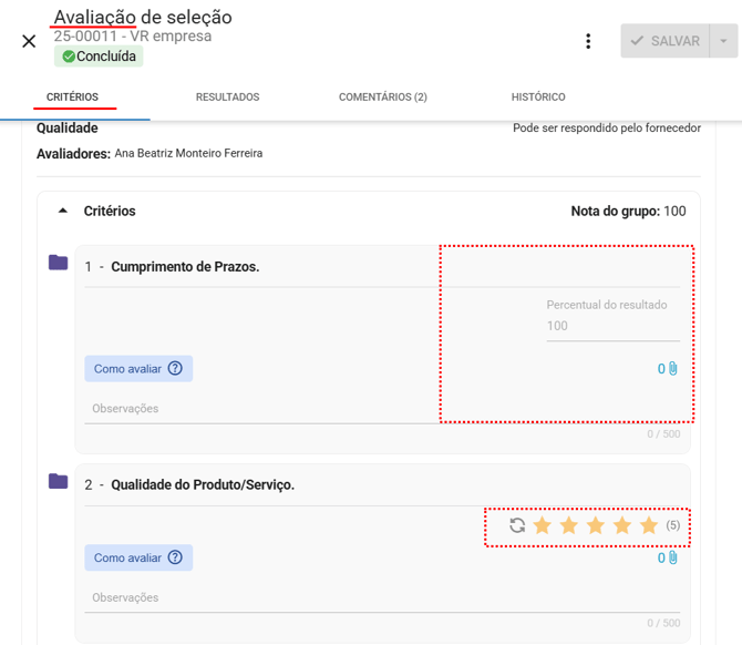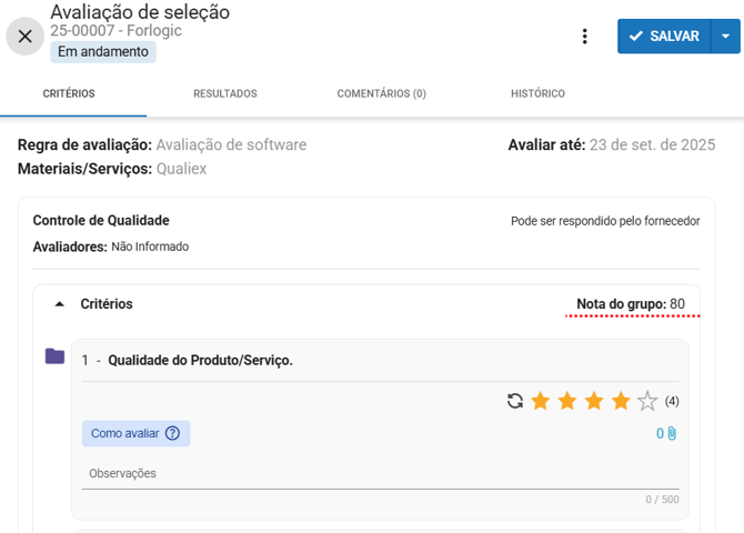 Resultado do grupo: nota do grupo gerada pelo Qualiex após registro da avaliação dos critérios.