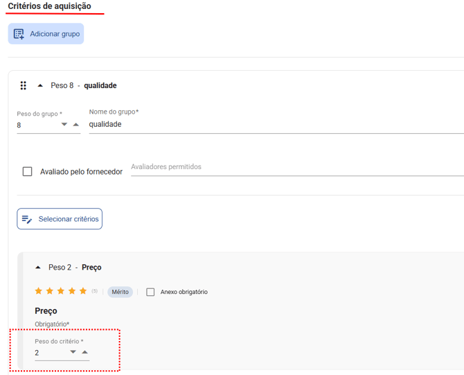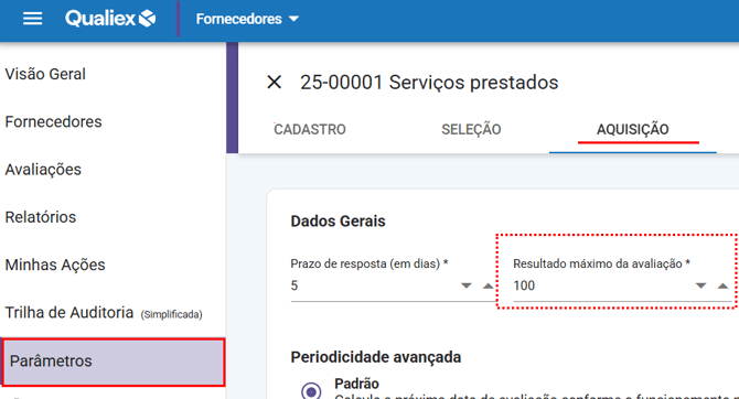 Para avaliar o desempenho do fornecedor de acordo com os requisitos que possuem mais impacto para a nossa organização, é possível definir os critérios que serão utilizados na avaliação de seleção (homologação) e aquisição com seus devidos pesos, e também, a nota máxima de cada avaliação.