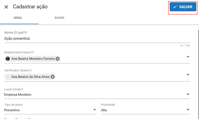 Verificador (Quem?): Informe o usuário que será o verificador da ação, responsável por assegurar a conformidade da mesma. Havendo verificador informado, apenas ele conseguirá concluir a ação.
