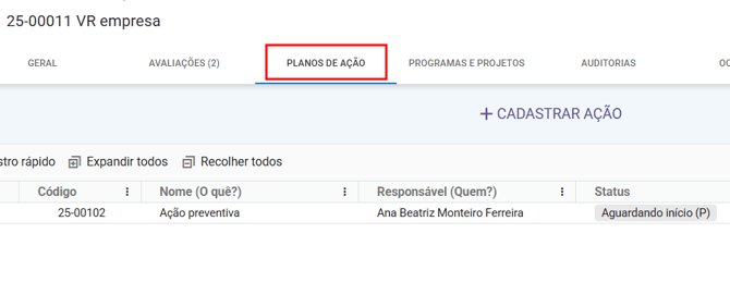 Após acessar o fornecedor desejado, clique na aba “Planos de ação”, onde você encontrará a listagem de todas as ações cadastradas para o fornecedor.