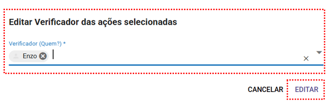 Após selecionar a opção "Verificador" na edição é necessário informar o usuário que será definido como verificador da ação e salvar a alteração clicando em