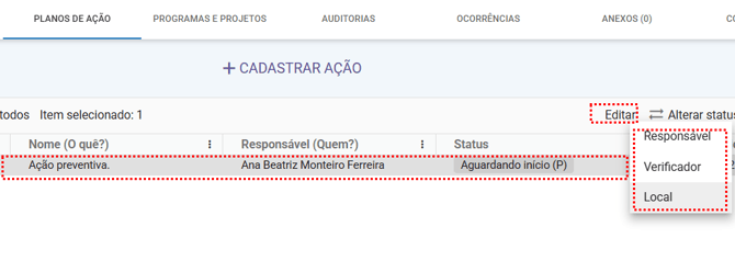 Para situações onde é necessário realizar algum ajuste nos campos da ação, é possível editá-la. A edição da ação possibilita o ajuste pontual dos campos necessários, sem a necessidade de cadastrar novamente uma ação e inserir as informações novamente nos demais campos. Além disso, é uma movimentação que fica registrada no histórico da ação, viabilizando a rastreabilidade das informações alteradas.