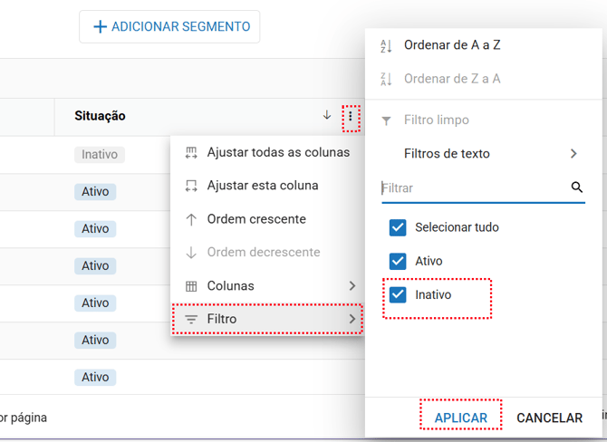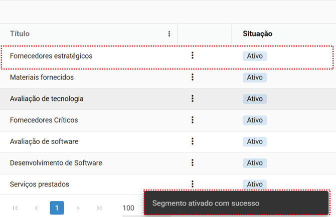 Após desativar o segmento (avaliação), ele ainda será exibido na listagem junto com os segmentos (avaliação) ativos. No entanto, se desejar visualizar apenas os segmentos (avaliação) ativos, você pode usar o filtro na coluna de situação para trazê-los à tela.