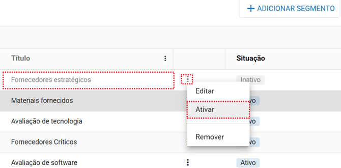 Para casos em que um segmento (avaliação) inativado anteriormente deva ser utilizado novamente, podemos ativar o mesmo.