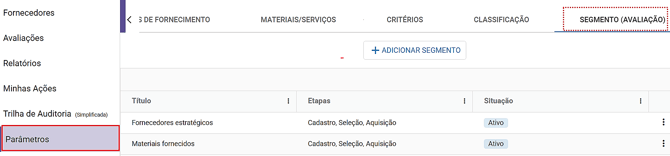 No módulo Fornecedores, clique na aba "Parâmetros" e, em seguida, na aba "Segmento (avaliação)".