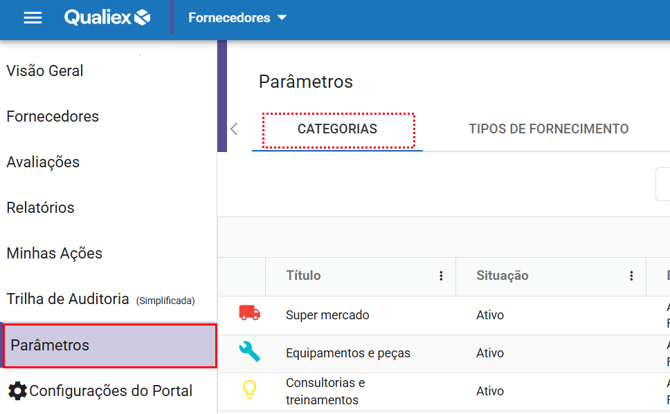 No módulo de Fornecedores clique na aba "Parâmetros" e em seguida na aba "Categorias" .