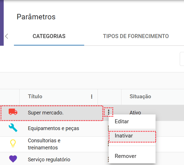 Nos casos em que uma categoria previamente cadastrada e utilizada no módulo Fornecedores não seja mais apropriada ou necessária para classificar os fornecedores, é recomendável inativá-la. Isso evita sua seleção no cadastro do fornecedor, pois ela deixará de ser exibida na listagem de categorias e garante a rastreabilidade das informações.