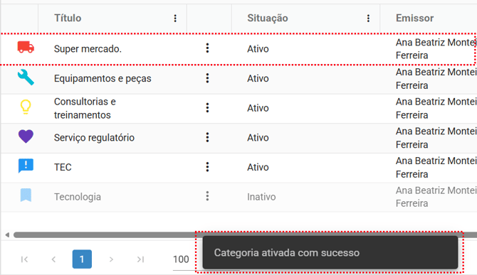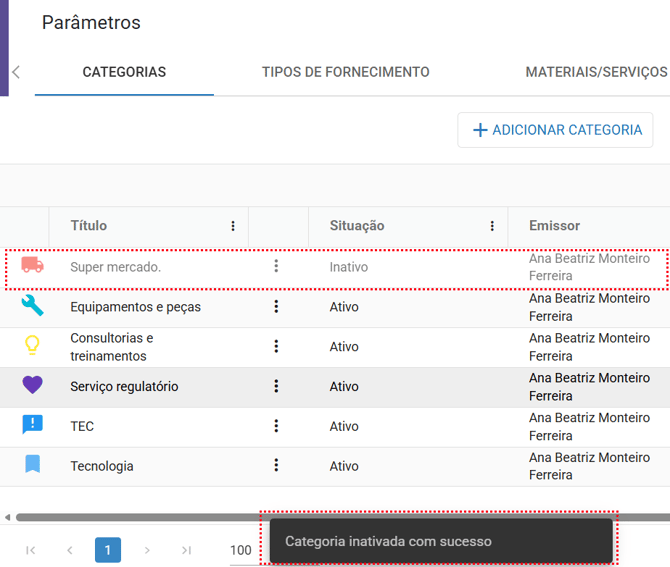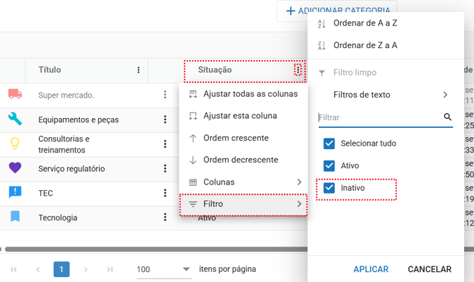 Após inativar a categoria, a mesma será exibida desfocada e na coluna de situação como inativo: