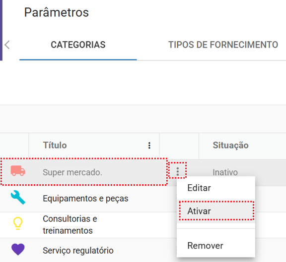Caso seja necessário utilizar uma categoria de fornecedor que tenha sido inativada anteriormente, podemos simplesmente ativá-la.