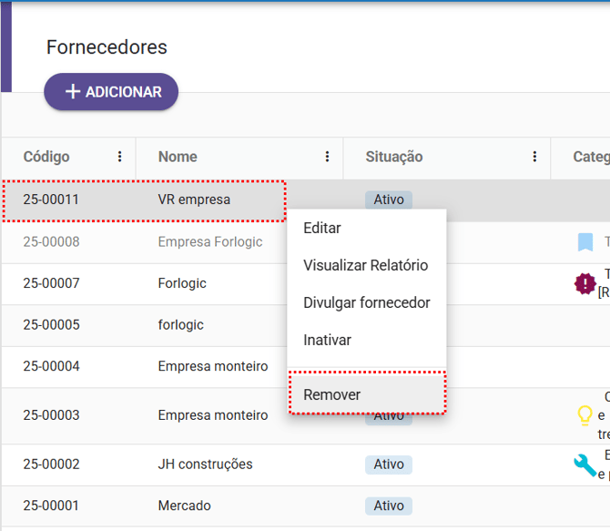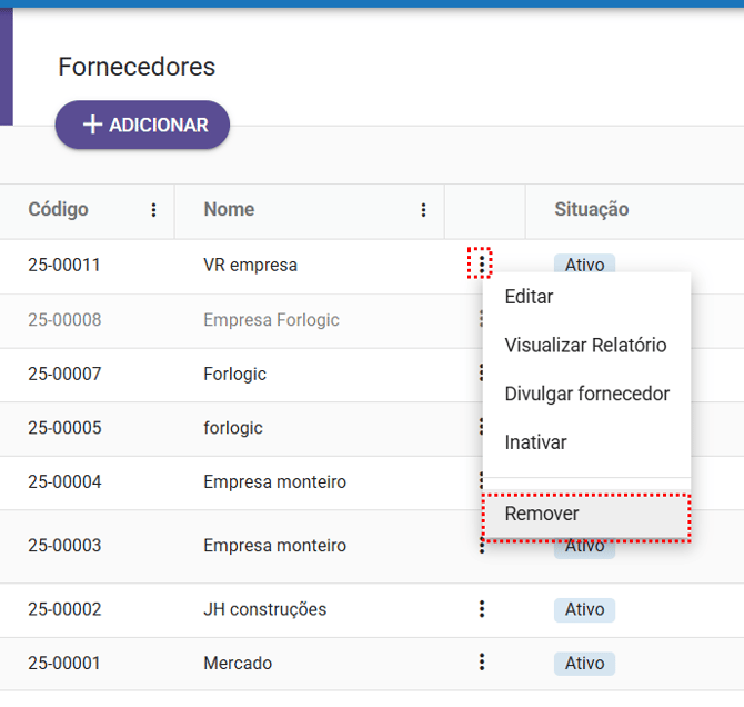 do fornecedor, o qual também conta com a opção de “Remover”: