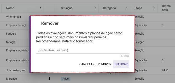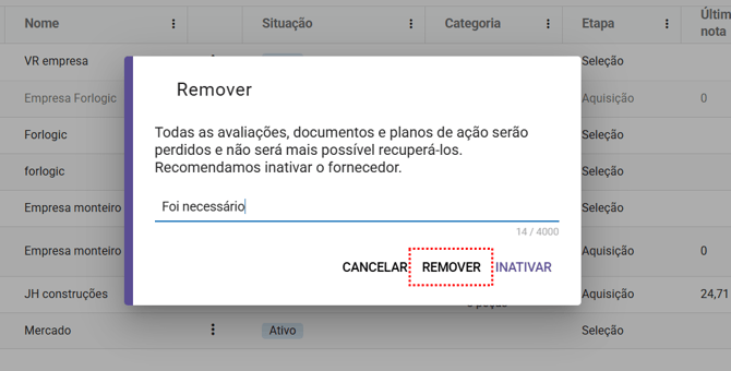 Importante! Recomenda-se que o fornecedor seja inativado ao invés de removido, pois todas as informações removidas são permanentemente perdidas e não podem ser recuperadas.