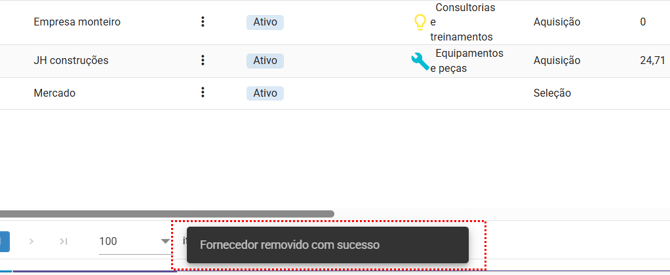 Dessa maneira, o fornecedor deixa de existir no sistema e não será mais exibido na listagem de fornecedores do módulo. Essa alteração gera uma notificação na parte inferior da tela informando que o fornecedor foi removido com sucesso: