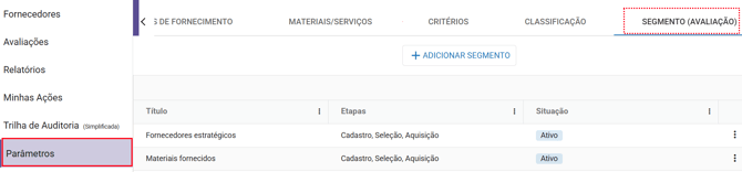 No módulo Fornecedores, clique na aba “Parâmetros” e, em seguida, na aba “Segmento (Avaliação)”.