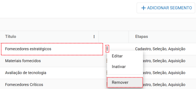 Em certos casos, pode haver um segmento (avaliação) que foi previamente cadastrado e utilizado no módulo Fornecedores. No entanto, devido a atualizações e ajustes no processo, não é mais aconselhável utilizá-lo. Nesse cenário, é possível proceder com a remoção do segmento (avaliação).