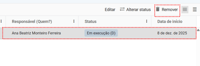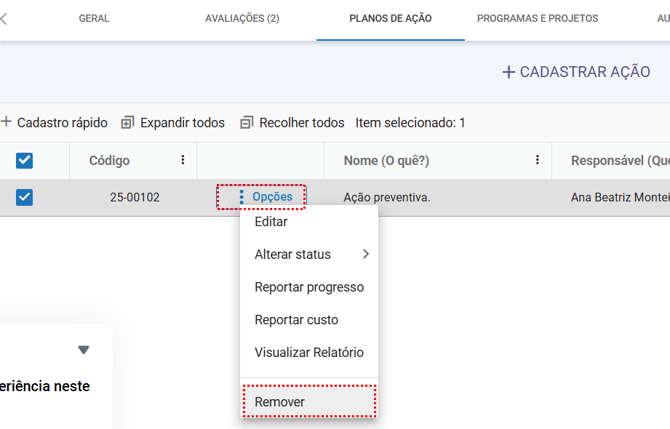 Também é possível remover a ação, selecionando a caixa de seleção na lateral direita da ação e posteriormente, clicando na opção de
