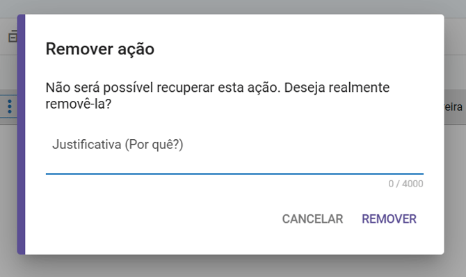 Em casos onde uma ação foi cadastrada indevidamente ou não é mais relevante mantê-la no sistema, é possível removê-la. Por exemplo, se uma ação foi registrada por engano ou se tornou obsoleta, o sistema permite sua exclusão.