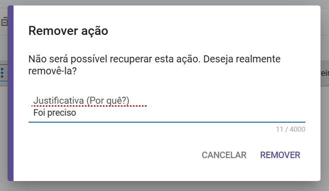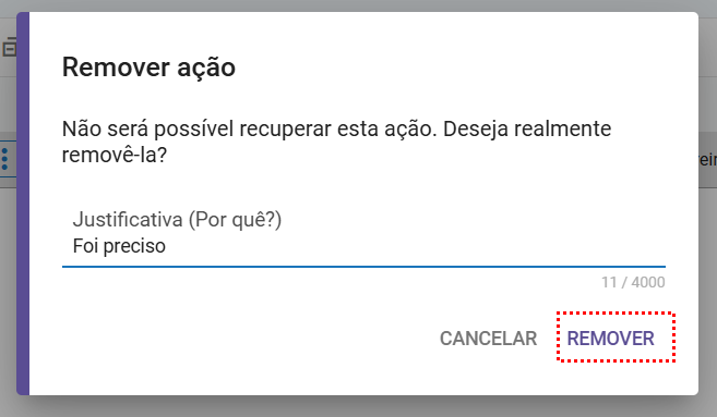 O campo de justificativa para essa alteração não é obrigatório, mas é uma boa prática inserir o motivo pelo qual a remoção está sendo realizada:
